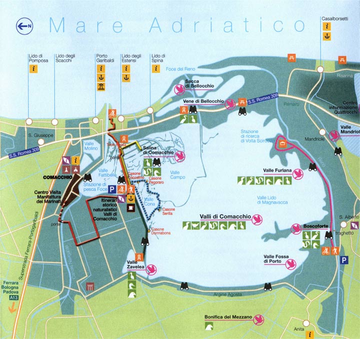 Seguendo i cartelli del percorso naturalistico si raggiunge la stazione di pesca "Casone Foce" da dove partono mumerose escursioni in barca o a piedi, passando vicino agli antichi casoni da pesca.