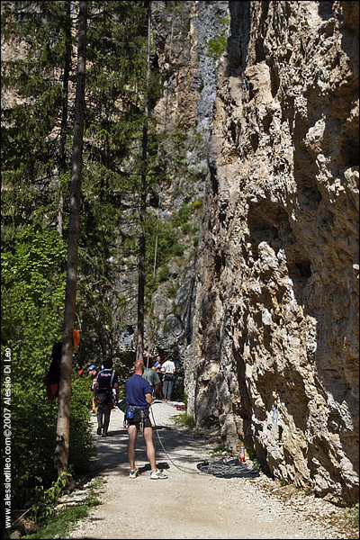 E' un falsopiano adatto a tutti in quanto non ci sono dislivelli importanti e l'unica difficoltà è doversi chinare ogni tanto per non sbattere la testa sul tetto roccioso, in qualche punto un pò basso. Si sviluppa per circa 2,5 Km di cui circa 500 in roccia e circa 300 su passerella, il tutto reso sicuro da un robusto parapetto in legno. Per il resto il percorso attraversa zone di bosco e costeggia una parete di roccia per scalatori; il tutto è percorribile in meno di un'ora.