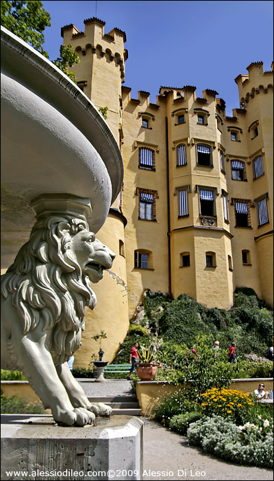 La corte del castello di Hohenschwangau, nel giardino la fontana dei leoni La visita guidata di Hohenschwangau inizia attraversando due portali esterni che conducono all'ampio giardino: qui si trovano fontane, statue, stucchi e dipinti che decorano le camminate e la grande balconata. L'interno è riccamente arredato con numerose opere d'arte. La stanza più interessante è senza dubbio la grande sala degli eroi, che si estende per tutta la lunghezza del castello, piena di dipinti e sculture raffiguranti miti e storie della Germania medioevale. Uno spettacolo da lasciare a bocca aperta!